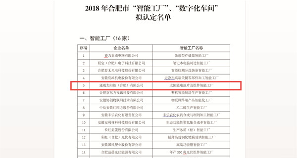 近日,合肥市經(jīng)濟(jì)和信息化委員會(huì)網(wǎng)站公示了2018年合肥市“智能工廠”、“數(shù)字化車間”擬認(rèn)定名單,通威太陽(yáng)能(合肥)有限公司“太陽(yáng)能電池片及組件智能工廠”榮列公示榜單,展現(xiàn)了公司在信息化和智能制造技術(shù)方面的高效應(yīng)用,同時(shí)也是對(duì)公司取得的自動(dòng)化、信息化、智能化成果的充分肯定。