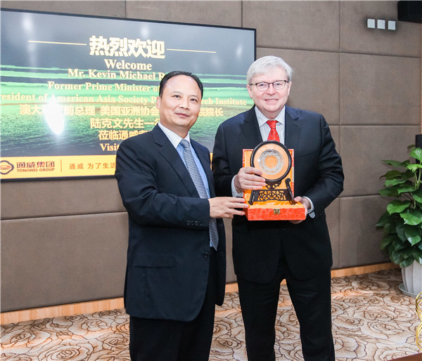 8月6日,澳大利亞前總理、美國亞洲協會政策研究院院長陸克文先生一行蒞臨通威考察。十一屆全國政協常委、全國人大代表、通威集團董事局劉漢元主席,通威集團禚玉嬌總裁,通威集團副總裁黃其剛熱情接待并座談。