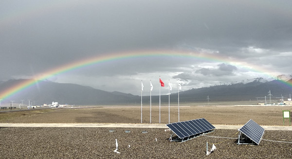 通威集團“青藏綠色驛站”離網光伏發電系統在彩虹下映照