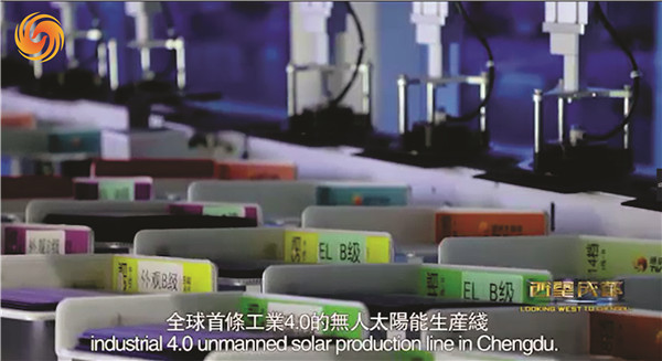 《西望成都》節目重點展現了通威太陽能無人產線,并指出,在生產領域,成都已經布局了堪稱“超級工廠”的通威太陽能無人生產線——世界首條工業4.0“智能制造”高效電池生產線。在這座“超級工廠”里,沒有操作工人忙碌的身影,只有兩三位工程師進行著設備調試,只有車間里的自動化、智能化設備及數量極少的工程師。