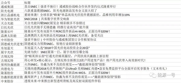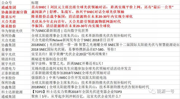 本屆SNEC期間,各家企業的新聞“競跑”成為關注熱點。對此,“能源一號”特地選取了國內60家新能源企業的官方微信作為樣本系數,并結合第三方、內部數據庫的權威統計,揭曉SNEC企業官方微信新聞排行榜。