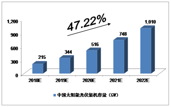 2015年,中國光伏裝機總量為43.18GW;2016年達到77.42GW;2017年,我國光伏新增裝機量達到53.06GW,累計裝機量已經達到130.25GW。我們預計,2018年中國太陽能光伏裝機容量將達到215GW,未來五年(2018-2022)年均復合增長率約為47.22%,2022年將達到1010GW。
