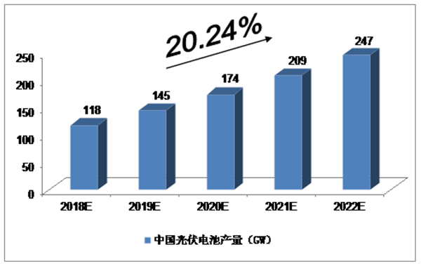 2015年,中國光伏電池(太陽能電池)產量為58.63GW;2016年產量達到76.81GW;2017年產量達94.54GW。我們預計,2018年中國光伏電池產量將達到118GW,未來五年(2018-2022)年均復合增長率約為20.24%,2022年將達到247GW。