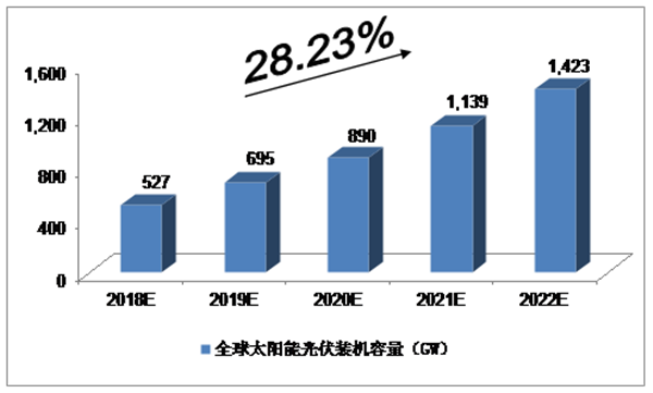 全球太陽能光伏發電累計裝機容量由2012年的100.5GW增長到2016年的306.5GW,年均復合增長率高達32.15%;2017年,全球光伏市場新增裝機容量達到102GW,同比增長超過37%,累計光伏容量達到405GW。我們預計,2018年全球太陽能光伏裝機容量將達到527GW,未來五年(2018-2022)年均復合增長率約為28.23%,2022年將達到1423GW。
