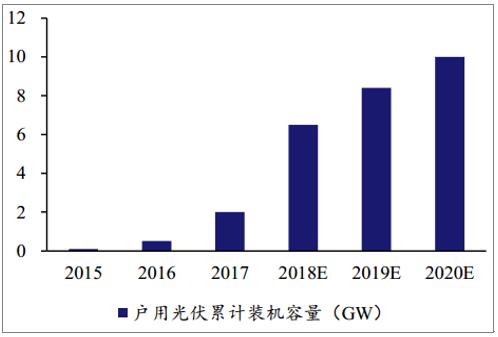 戶用光伏市場廣闊,未來大有可為。預(yù)計國內(nèi)有超過4000萬戶獨立屋頂,其中約有50%具備安裝戶用光伏系統(tǒng)的條件,假設(shè)每套裝機(jī)容量為5kW,那么裝機(jī)容量能夠達(dá)到100GW。如果具備安裝條件的屋頂中有 20%-50%安裝戶用光伏系統(tǒng),那么市場規(guī)模將達(dá)到3,200-8,000億元,而目前已經(jīng)開發(fā)的屋頂數(shù)量占比還不到5%,市場前景良好。2018年我國戶用光伏累計裝機(jī)量預(yù)計能夠達(dá)到6-8GW,預(yù)計2020年市場規(guī)模可以超過10GW。