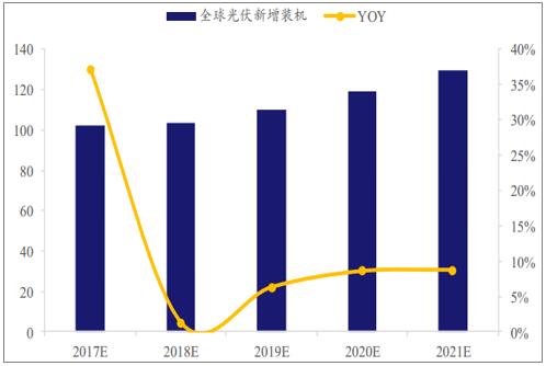 2018-2021年全球光伏新增裝機(jī)預(yù)計保持高位(GW)