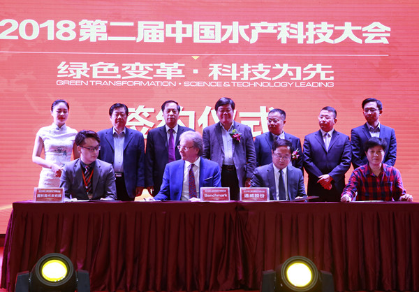為樹立和嘉獎(jiǎng)行業(yè)標(biāo)桿,激活創(chuàng)新動(dòng)能,大會(huì)隆重舉行了“2018中國水產(chǎn)科技大會(huì)頒獎(jiǎng)盛典”。由水產(chǎn)權(quán)威機(jī)構(gòu)與企業(yè)代表組成的評(píng)委團(tuán),根據(jù)科技創(chuàng)新、行業(yè)貢獻(xiàn)等方面進(jìn)行綜合評(píng)比,最終評(píng)選并現(xiàn)場頒發(fā)了“年度突出科技創(chuàng)新獎(jiǎng)”、“年度杰出成果轉(zhuǎn)化獎(jiǎng)”、“年度卓越貢獻(xiàn)獎(jiǎng)”、“年度最佳商業(yè)模式獎(jiǎng)”四大重磅獎(jiǎng)項(xiàng)。大會(huì)期間,通威股份嚴(yán)虎副董事長,英國BENCHMARK控股有限公司董事、比利時(shí)英偉水產(chǎn)集團(tuán)全球總裁Philippe Leger,國科現(xiàn)代農(nóng)業(yè)產(chǎn)業(yè)科技創(chuàng)新研究院國際合作交流中心總監(jiān)助理任意達(dá),河北鑫海水產(chǎn)生物技術(shù)有限公司董事長許圣鈺分別代表四家企業(yè)上臺(tái),共同簽署《四方戰(zhàn)略合作意向框架協(xié)議》,攜手共促我國水產(chǎn)科技創(chuàng)新,推動(dòng)行業(yè)快速發(fā)展!
