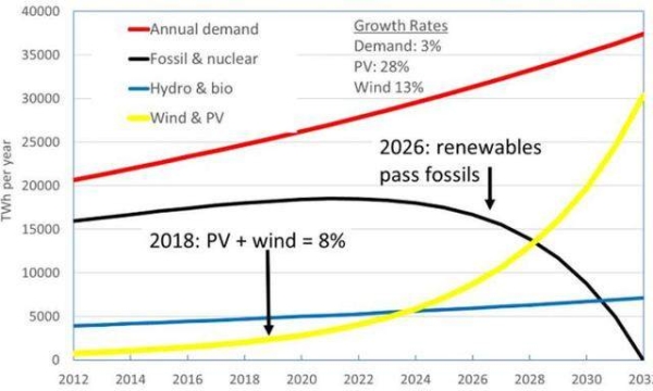 幾十年來,光伏和風(fēng)能呈指數(shù)增長,2018年,光伏和風(fēng)能將占全球新增發(fā)電量的60%。從全球投資走向來看,今年將投資1610億美元用于太陽能發(fā)電,而新的煤炭和天然氣投資合計僅為1030億美元。目前,光伏和風(fēng)能的增長速度使得其總裝機容量已經(jīng)達(dá)到了煤的一半,并且將在2020年中期超過煤炭。
