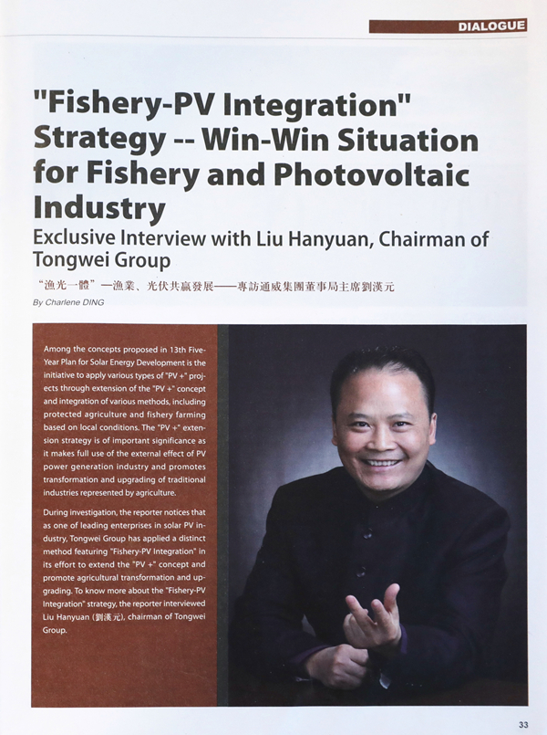 與此同時,被稱為“中國第一刊”的國家級權威媒體《半月談》、新華社旗下的《經濟參考報》、中國首本全英文能源雜志《CEFC China Energy Journal》紛紛聚焦通威。尤其是《CEFC China Energy Journal》推出題為“‘漁光一體’——漁業、光伏共贏發展”的劉主席全英文深度專訪,詳細報道了通威正大力推廣的“漁光一體”創新模式及通威新能源產業的戰略布局。報道指出,該模式實現了傳統水產養殖和清潔能源生產的有機結合,整合空間實現國土面積增值復用,提高單位面積每年輸出價值,對環境集約化發展有很大貢獻。