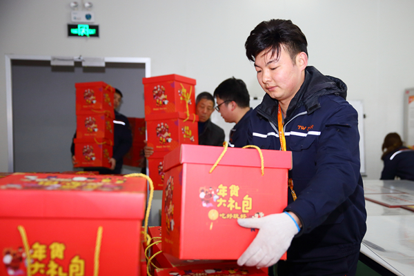 早在一個月前,兩地公司工會的工作人員便著手為全體員工采購新春禮品。當天一大早,滿載著“新春年貨”的貨車緩緩駛入兩地廠區,在工作人員的指引下,“派送小分隊”先后來到各生產車間及職能部門禮包派送指定地點,伴隨著大家的歡聲笑語以及新春祝福,將品種多樣的新春大禮包送到員工手中,讓全體員工在感受公司人文關懷的同時為家人送上一份豐厚的新春大禮。