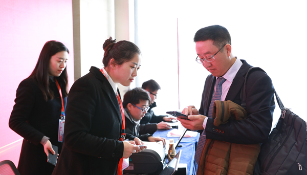 工作人員為嘉賓分發(fā)參會證
