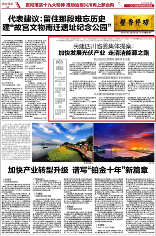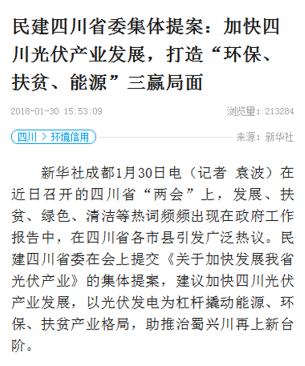 近日召開的四川省“兩會”上,民建四川省委集體提交了一份《關于加快發展我省光伏產業的提案》。提案建議,加快推進光伏產業發展,不僅可改善霧霾問題,還可結合我省先天資源稟賦和優越地理特點,率先在全國走出一條以水電和光伏發電作為主要能源供應的清潔發展之路。該提案引發社會各界廣泛熱議,并受到主流媒體的強烈關注,新華社刊出《民建四川省委集體提案:加快四川光伏產業發展,打造“環保、扶貧、能源”三贏局面》的報道文章,閱讀量突破24萬,關注熱度還在持續增長。