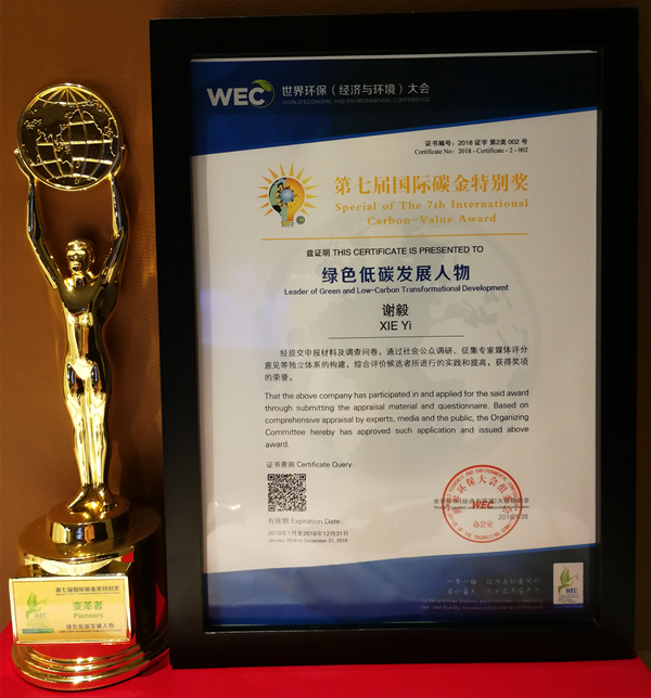 “第七屆國際碳金獎特別獎?綠色低碳發展人物”獎牌與獎杯