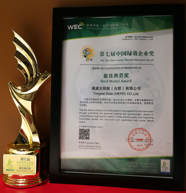 大會揭曉了國際碳金獎評選結果,以“打造世界級清潔能源企業,讓太陽能造福人類”為發展愿景的通威太陽能合肥公司,在清潔能源方面的突出貢獻及卓越的經營績效,榮膺國際碳金獎單項獎"第七屆中國綠效企業獎?最佳典范獎"。此外,通威太陽能董事長謝毅榮獲“第七屆國際碳金獎特別獎?綠色低碳發展人物”殊榮。