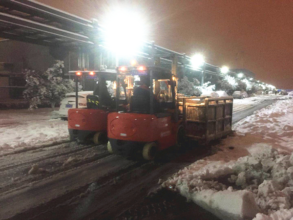 1月5日凌晨,由通威太陽能合肥公司總經理謝泰宏帶隊的安全小組巡視各廠、各生產車間,針對廠區各重點區域及生產車間,明確責任區、責任人,迅速,及時做好廠房、樹木積雪清理工作,消除暴雪積壓產生的安全隱患,同時增設雨雪防滑提示標志。